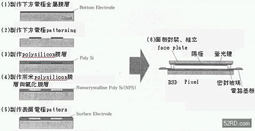 由于BSD的彈道電子釋放現象所產生的電子發射角度幾乎是無偏差的垂直角,因此BSD的FED可無限制的選用適用的spacer。如上所述BSD最大特點(advantage)是它的制作性,傳統高電壓型FED的發射電極(emitting)是先制作發射平臺(hall),再制作Al2O3與Wo、Ni等覆蓋層(scapegoatlay)垂直膜層,最后利用蝕刻(etching)技術去除覆蓋層,相較之下BSD之FED的電子發射源祇需制作復晶硅膜,之后再經過膜層多孔化與氧化等制程即可,如此簡易的制程對平面顯示器(FPD:FlatPanelDisplay)大型化與低價化具有加乘效應。