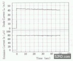 圖7是BSD電子源的emission電流時間變化特性圖,橫軸為時間,縱軸為電流密度,二極體電壓為16V,如圖所示二極體電流IPS與釋放電流Ie,不會隨著電流發生spike,亦即所謂的閃爍(flicker)現象,顯示BSD電子源不需外部電路,就可獲得傳統Spendtype電子源無法達成的特性。