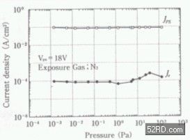 圖8是BSD電子源的周圍真空度發生變化時的emission電流變化特性,具體測試方法是將爐內更換成氮素,接著抽真空至10-4Pa再逐漸導入氮素,藉此觀察真空度變化時的emission電流變化,圖中的橫軸為真空度,縱軸為二極體(diode)的電流密度,由圖可知即使真空度降至10-4,emission的電流密度幾乎無任何改變,顯示BSD電子源在真空度非常惡劣的環境下,仍具備良好的emission特性。