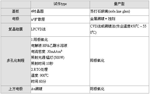 上述第1與第4項之流程系使用現有的成膜技術與材料;第2與第3項則為松下公司開發的多孔化PPS技術。有關第2項復晶硅膜制程必需將作業溫度與壓力等參數作最佳化組合,如此便可使蘇打石玻璃在450°C~550°C的低溫環境下完成長膜作業。第3項的電解液、液溫、電流密度等參數經過作最佳化后,在一定條件下進行陽極氧化,之后必需再度更改制程參數(processparameter)才可再進行陽極氧化作業。