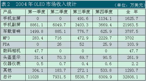 OLED已進入的產品領域包括手機主屏和副屏、汽車音響、MP3、工業儀表、PDA、車載儀表、數碼相機和微顯示器(MicrodisplayforNearEyeApplication)等領域。其中,手機副屏約為2.2億美元,占67%,汽車音響約為0.38億美元,占11.6%,MP3屏為0.37億美元,占11.3%,這三者共占了約90%。