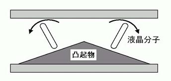 如圖,它依*叫做Protrusion的屋脊狀凸起物來使液晶本身產生一個預傾角(Pre-tiltAngle)。這個凸起物頂角的角度越大,則分子長軸的傾斜度就越小。早期的VA模式液晶凸起物只在一側,後期的MVA凸起物則在上下兩端。