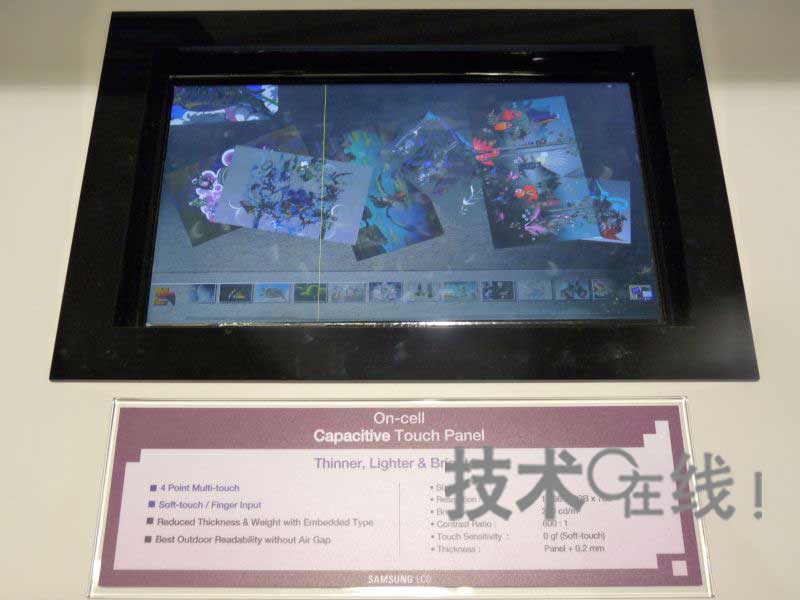 韓國三星電子此次展出了兩款內置觸摸面板功能的On Cell方式液晶面板。分別為是(1)嵌入電阻膜式觸摸面板功能的10.1英寸液晶面板,以及(2)嵌入靜電容量式觸摸面板功能的13.3英寸液晶面板。兩款產品均可4點輸入。目前正以2011年開始量產為目標推進開發。