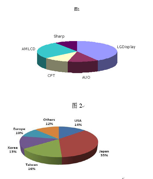 數據顯示,國內所有的LED TV面板來源全部進口,其中有部分open cell的模式,但是背光模組仍是采用指定購買的方式。從中國大陸地區LED面板供應來源來看,以2010年第一季度為例,主要供貨來源為LG Display, AMLCD, AUO, CPT(如圖1),其中CPT供貨多數為小尺寸。而從全球LED面板產值來看,日本廠商目前為市場領導者,臺灣和韓國廠商積極擴大產值(如圖2)。由此來看,LED TV面板產業市場集中度非常高,未來的LED TV市場的競爭格局主要受限于廠商的資源分配情況。