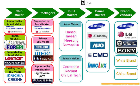 為緩解資源緊缺的狀況,在過去兩年的整合并購中,面板廠和整機廠扮演了關鍵的角色(圖4),全球LED領域的資源布局雛形已然成型。