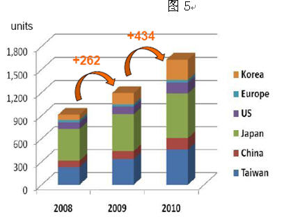 晶粒方面,預估全球MOCVD數量逐步增加(圖5),其中以韓國和臺灣廠商最為積極,Samsung, LG Innotek以及AUO旗下的Lextar都將增加MOCVD機臺數量至目前的2~3倍。到2010年底,預計全球高亮度LED晶粒月產能將接近200億,但目前市場應用仍以移動終端產品和汽車照明用為主,前兩者的應用比重高達55%,但TV用背光源應用比重總體仍將難突破20%,因此背光源缺貨狀況的緩解將需要較長時間。