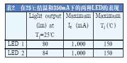 在數據表描述的25℃結溫和350mA的前向電流下,LED2的性能比LED1要好。但是,更實際的比較將在更高的結溫下進行(見表3)。