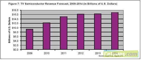 2009年電視半導體銷售額高達93億美元,由于液晶電視需要更多的半導體芯片支持各種高級功能,2010年銷售額有望更上層樓。iSuppli公司的預測顯示,2010年電視半導體市場將達到121億美元。
