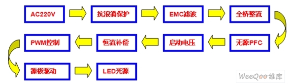 LED光源陣列設計為0.06W白光LED(SMT或草帽燈)24個串聯、12串并聯的方案,驅動288個小功率WLED,總功率18W。全電壓18WLED日光燈開關恒流源的設計電路如圖2所示,其各部分的功能如紅字所標注。圖中抗雷擊和EMI濾波組成EMC電路,饋流供電是利用已經做在芯片內部的整流二極管來實現的。