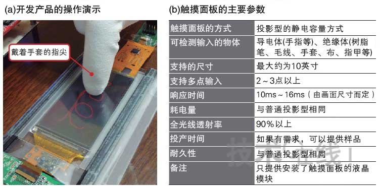 除了可以用絕緣物輸入的特點(diǎn)以外,在具有10ms~16ms的響應(yīng)時間、90%以上的全光線透射率以及耗電量和耐久性等方面,此次開發(fā)的產(chǎn)品與普通的投影型性能相同。在檢測控制方面,可使用原來用于投影型的控制器IC。