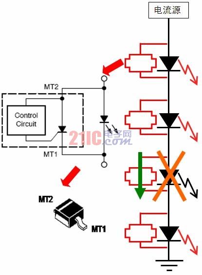 增強LED串可靠性的保護方案如前所述,區域照明應用中通常會采用多串LED。雖然LED本身的可靠性很高,但如果LED串中的某個LED發生開路故障,那么整串LED就可能關閉,而街道照明等應用中就要避免這種狀況,從而降低后期維護成本。有鑒于此,安森美半導體推出了NUD4700 LED電流旁路保護器(見圖3)。這器件是一款分流器件,萬一LED串中某個LED開路,則會提供電流旁路,確保在某個LED故障的條件下整串LED不會關閉;而且恰當處理散熱的話,還可支持大于1 A的大電流。