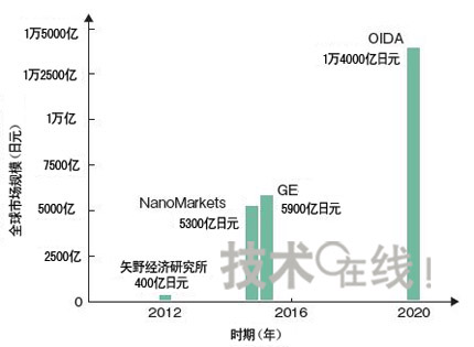 [page]圖有機(jī)EL照明/光源市場到2020年將占到照明市場整體的2成圖為針對包括普通照明、特殊照明及背照燈等在內(nèi)的有機(jī)EL照明今后的市場規(guī)模,日本矢野經(jīng)濟(jì)研究所、NanoMarkets、GE及OIDA發(fā)布的預(yù)測及目標(biāo)。市場規(guī)模方面,預(yù)計(jì)2015年全球?qū)⑦_(dá)到5000多億日元,到2020年將大大超過1萬億日元。