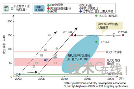政府機(jī)構(gòu)的資助額大多為3年內(nèi)數(shù)億~30億日元的規(guī)模,德國“OPAL(OrganicPhosphorescentlightsforApplicationsintheLightingmarket)”項(xiàng)目為5年內(nèi)1億歐元(約合140億日元),遠(yuǎn)遠(yuǎn)多于其他項(xiàng)目。在發(fā)光效率方面迅速追趕白色LED有機(jī)EL照明雖然具有一些獨(dú)特的特點(diǎn),但考慮到實(shí)際影后,還是避免不了在發(fā)光效率、使用壽命、成本等基本性能上與白色LED及現(xiàn)有照明技術(shù)一決高低。近來有機(jī)EL照明的性能得到了大幅提高。首先是發(fā)光效率。目前,有機(jī)EL照明在研發(fā)水平上比白色LED約落后約2年。2008年6月美國UniversalDisplay(UDC)發(fā)布的“102lm/W”的發(fā)光效率,與2006年3月日本日亞化學(xué)工業(yè)發(fā)布的白色LED的發(fā)光效率不相上下。山形大學(xué)的城戶表示,“已經(jīng)看到了實(shí)現(xiàn)200lm/W的曙光”)。