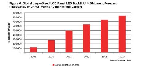 據IHS iSuppli公司預測,2011年全球出貨的三分之二以上大尺寸液晶面板將采用LED背光,該比例2010年低于50%。預計2011年將有67%的大尺寸液晶面板采用LED背光,高于2010年的44%。2011年LED背光大尺寸液晶面板出貨量將達到4.956億塊,比2010年的2.833億塊大增74.9%。