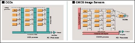 而現在普遍使用的兩種圖像傳感器就是大家經常聽說到的CMOS和CCD傳感器了,為了讓大家最終更好地認識背照式CMOS傳感器,小編在此也簡單說一下兩種傳感器的異同以及優缺點。如下圖所示,左邊為CCD傳感器的結構,右邊的為CMOS傳感器的機構,黃色的小方塊為像素點。由圖示可以看出,CCD傳感器中每一行中每一個象素的電荷數據都會依次傳送到下一個象素中,由最底端部分輸出,再經由傳感器邊緣的放大器進行放大輸出;而在CMOS傳感器中,每個象素都會鄰接一個放大器及A/D轉換電路,用類似內存電路的方式將數據輸出。簡單說就是對待單個像素點上得到的電荷數據有不同方法,CCD是全部傳輸出來再統一處理,CMOS是先分別處理在傳出來。這兩種方式并不是人們憑空想象出來的,而是由CCD和CMOS的制作工藝決定的,因為CMOS器件內傳輸數據會有較高的失真,所以需要先做處理。