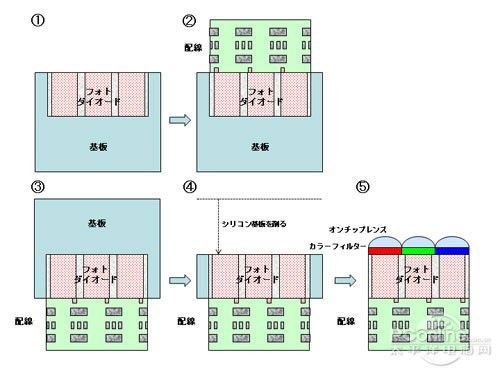 背照式CMOS傳感器的具體結構如上圖所示(源自索尼資料,其他芯片廠家的產品可能在細節上有不同,但大體意思是相同的),橙色的為光線路,黃色線為受光面。左邊的傳統式,明顯看到光線通過微透鏡后還需要經過電路層才能到達受光面,中途光線必然會遭到部分損失(包括被阻擋或被減弱)。背照式CMOS傳感器的元件則不同,在改變了結構后,光線通過微透鏡后就可以直接到達感光層的背面,完成光電反應,從進光量上改善了感光過程。[page]