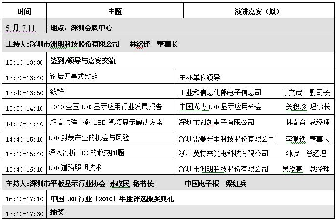1.講座   主辦方將邀請國內知名LED行業專家分析2010年中國LED產業發展問題、2011年中國LED企業的總戰略及調整方向,預測中國LED市場各領域(原材料、設備、外延芯片、顯示屏、照明等)的投資情況分析及趨勢。