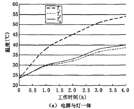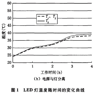 由于電源本身產(chǎn)生一定的熱量,使得LED燈上的熱量來(lái)源增加。同時(shí),電源與燈一體設(shè)計(jì)使得LED燈整體受熱不均,這些因素都會(huì)導(dǎo)致燈具發(fā)生疲勞和早期失效,而影響其壽命。圖1為L(zhǎng)ED燈溫度隨工作時(shí)間的變化曲線,圖中T1為放置電源處溫度,T2為遠(yuǎn)離電源處溫度,T3為燈體中心溫度。從圖中看出,隨著工作時(shí)間的增加,圖1(a)中T1遠(yuǎn)大于T2和T3;圖1(b)中T1與T2兩曲線重合,T3略大于T1和T2。可見(jiàn)分離電源后,整燈的溫度分布很均勻。