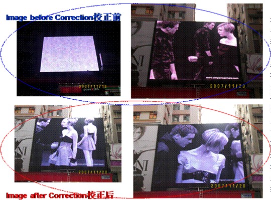 圖3 戶外顯示屏現(xiàn)場校正前后比較