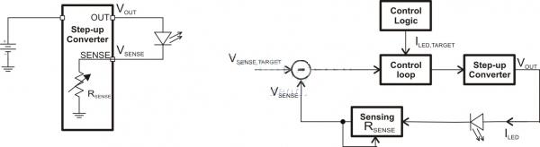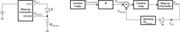 將閃光燈LED 與一個電流檢測電阻串聯(lián),然后通過一個升壓轉(zhuǎn)換器來驅(qū)動,這是一種簡單的方法。圖1 描述了這種方法。