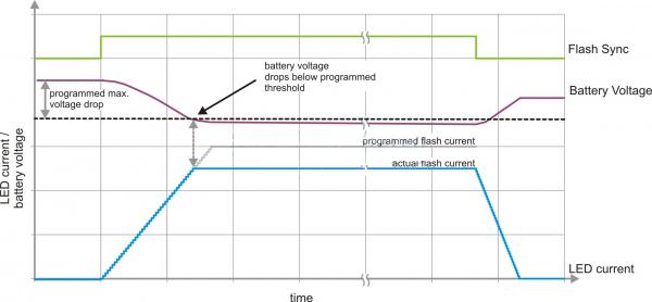 如果閃光燈驅(qū)動器本身能夠防止電池電壓下降過多,那么就可以保持較小的安全界限。通過使用一個受控轉(zhuǎn)換率升高LED 電流,并在上升期間持續(xù)監(jiān)控電池電壓可以實現(xiàn)這一目標(biāo)。