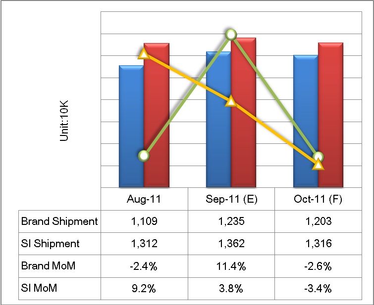 WitsView表示今年液晶顯示器年成長將呈現(xiàn)持平狀態(tài),全年預(yù)估出貨約為168M(臺(tái))。另外,預(yù)估AIO出貨量約為12~12.5M左右,由于今年全球景氣受到歐洲債務(wù)危機(jī)延燒沖擊,整體市場規(guī)模有限,各品牌廠商截至目前為止出貨量距離全年目標(biāo)尚有一段距離,再加上歐美市場需求疲軟,因此各品牌廠商將集中于中國十一長假期間放手一搏,透過強(qiáng)力降價(jià)促銷以把握機(jī)會(huì)沖刺,以爭取全年市占率。