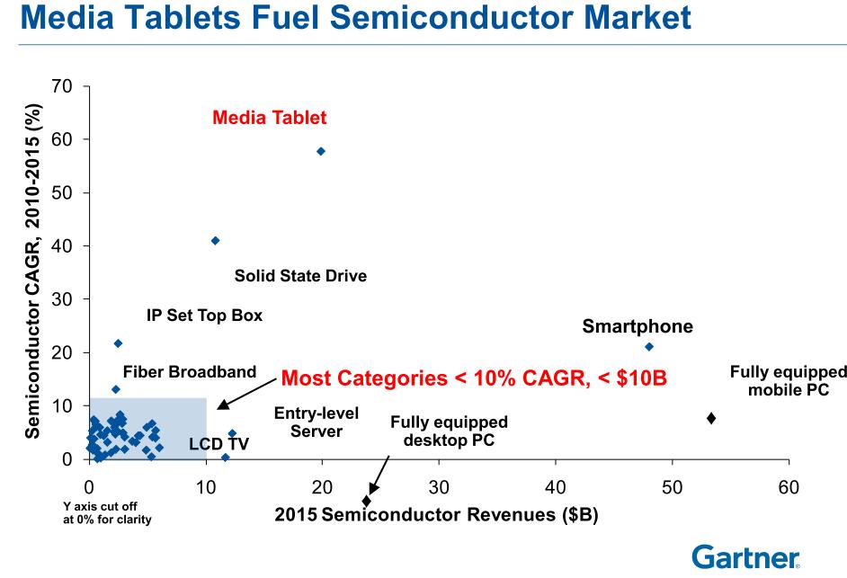 在這107項被調(diào)查的產(chǎn)品中,幾乎絕大多數(shù)在未來5年內(nèi)的半導(dǎo)體產(chǎn)值都在100億美元以內(nèi)(上圖左下角藍(lán)色部份)。而接下來的幾年,扮演推動半導(dǎo)體成長重任的產(chǎn)品,將從PC轉(zhuǎn)移到平板計算機(jī)、智慧手機(jī)和固態(tài)硬盤(SSD)身上。