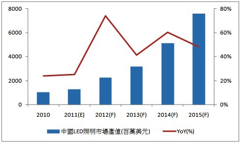 LEDinside統計2010年中國照明市場規模為122億美元(不含車用照明),其中 LED照明產值達到10.3億美元,未來幾年仍呈現明顯的成長。LEDinside預估,未來透過補貼政策與白熾燈泡禁用政策的推波助瀾下,中國LED照明市場規模至2015年將達到76億美元,躍身成為全球前三大LED照明市場之列,身兼生產與消費大國雙重角色,也成為國際廠商與本土照明廠商的最重要市場之一。