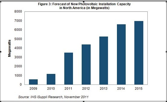 據IHS iSuppli公司的北美光伏市場報告,美國加州的許多太陽能項目經過多年開發之后終于投產,預計2011年北美的光伏(PV)太陽能系統安裝容量將大增200%。
