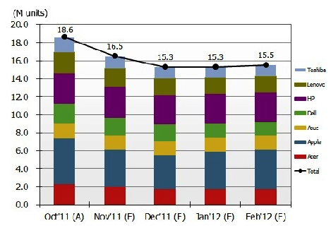 泰國水患造成硬碟機(HDD)短缺,預計此一供應缺口將持續到2012年第一季,同時影響筆電和桌上型液晶顯示器的生產計劃。 NPD DisplaySearch 特別看到可攜式個人電腦品牌正在減少低利潤產品如小筆電或15.6寸等主流機種;“從2012年第二季初,由于通路需要補回庫存并且展開2012年新機種的上市,可攜式個人電腦的產出將有顯著的增加。”楊靜萍表示。