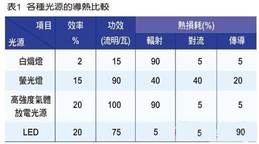 在此情況下,約20%輸入功率轉(zhuǎn)換為光,80%則轉(zhuǎn)換為熱。這取決于多種因素,發(fā)熱可能與底層不規(guī)則以及聲子發(fā)射、密封、材料等有關(guān)。在LED產(chǎn)生的總熱量中,有90%透過傳導傳輸。表1為耗散來自LED接面的熱量,傳導是導熱的主要通道,因為對流和輻射僅占全部熱傳輸約10%。比如一個LED可能轉(zhuǎn)換近10.72瓦熱量(13.4瓦×0.8)。其中,9.648瓦(10.72瓦×0.9)透過傳導從LED接面?zhèn)鬏敾蜻w移。顯然,LED光源需要精確的功率和熱管理系統(tǒng),因為與其他光源相比,提供給LED的電能大部分轉(zhuǎn)換為熱量。如果沒有適當?shù)臒峁芾恚@種熱量會影響LED壽命和色彩輸出。同時由于LED驅(qū)動裝置屬于硅組件,很快就會失效,因此必須配備故障安全備用過電流保護裝置。