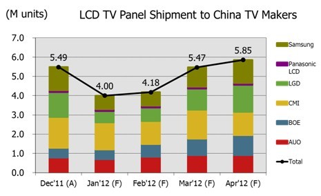 圖一、Dec’11~Apr’12電視面板出貨至大陸電視廠商的數(shù)量