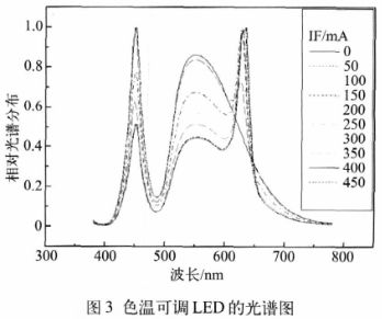 圖3為采用遠(yuǎn)方HASS-2000高精度快速光譜輻射計(jì)測(cè)量得到的色溫可調(diào)LED 的光譜圖,從圖中可以看出,隨著紅光LED 電流的變化(從0 到450mA),LED 的相對(duì)光譜也會(huì)隨之變化,LED 的光譜有三個(gè)峰值,分別在450nm、550nm和628nm,暖色溫的發(fā)光效率大于68lm/W,冷色溫的發(fā)光效率達(dá)到87lm/W。