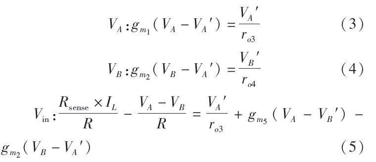 δ是一個分子為的微小值。由式(6)可以看出,當gm1ro2或gm2越大,VA與VB的匹配度越高,電流采樣越精確。值得注意的是,式中出現gm1ro3的平方項,這意味著可以用較小的增益達到高精度。但是,耐壓5 V的低壓管無法在高輸入電壓下正常工作,電路中必須使用大量耐壓40 V的高壓管。然而高壓管的增益與等效輸出電阻很低,無法滿足電流采樣電路的精度要求。