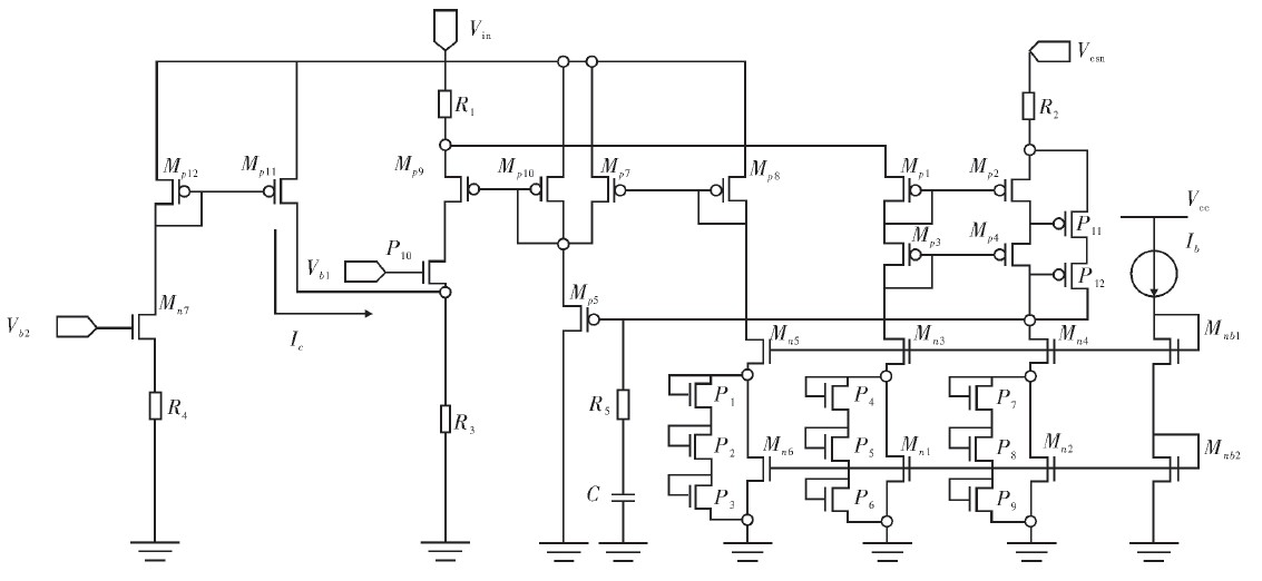 圖2是電路采樣電路結構圖。Rsense為采樣電阻,R1=R2=R;Mp1、Mp2、Mn1、Mn2組成的電壓鏡和Mp9反饋管組成匹配電流源作為電流檢測電路。其中Mp1與Mp2相互匹配并被偏置在飽和區,Mn1與Mn2是兩個相同且非常小的電流源,以保證流過Mp1與Mp2的電流相等從而使其具有相等的VSG。