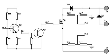 為了在夜間不同時(shí)刻采用不同的亮度,以達(dá)到節(jié)約電能的目的,本系統(tǒng)設(shè)計(jì)了兩路負(fù)載輸出,晚上12點(diǎn)以前兩盞LED皆亮,12點(diǎn)后一盞點(diǎn)亮,每路輸出均有立的控制和檢測(cè)。設(shè)計(jì)采用了PWM功率控制功能對(duì)LED燈具實(shí)現(xiàn)無級(jí)調(diào)光。單路原理如圖3所示。其中單片機(jī)P0.6 口給出控制信號(hào), 即P 0 . 6 = 1 時(shí), 三極管導(dǎo)通,繼電器閉合,MOS管導(dǎo)通,蓄電池向路燈供電。在電量不足或白天時(shí),控制端輸出低電平信號(hào),切斷供電回路。夜晚蓄電池電量不足情況下由市電供電系統(tǒng)給LED路燈供電,保證系統(tǒng)的完整和可靠。