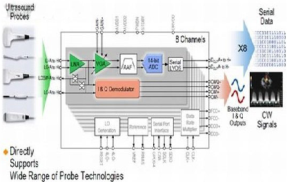ADI公司在四年前曾推出業(yè)界首款在單芯片上集成完整八通道超聲接收器的器件AD9271。ADI隨后又陸續(xù)推出其它八通道超聲接收器,包括用于中高端手推式超聲系統(tǒng)的AD9272、用于便攜式超聲系統(tǒng)的AD9273、以及支持高質(zhì)量連續(xù)波(CW)多普勒處理的AD9276和AD9277。而年前推出的新型八通道超聲模擬前端AD9278和AD9279再次改寫(xiě)了八通道超聲接收通道的性能:具有45dB的可變?cè)鲆娣秶⑷罘中盘?hào)路徑、有源輸入前置放大器終端、最大52dB的增益以及轉(zhuǎn)換速率高達(dá)80MSPS的模數(shù)轉(zhuǎn)換器。