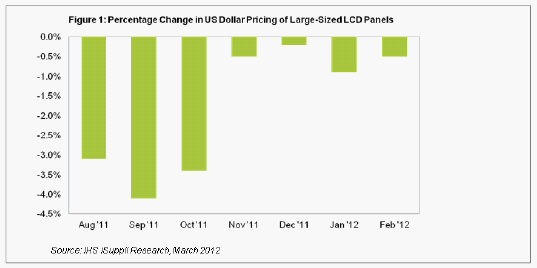 據(jù)IHS iSuppli公司的液晶(LCD)價格追蹤報告,盡管需求低迷,但2月份用于電視、監(jiān)視器和筆記本電腦的大尺寸液晶面板價格保持穩(wěn)定,下降0.5個百分點。