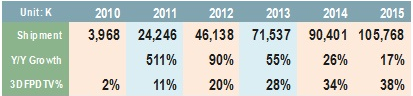 據(jù)NPD DisplaySearch調(diào)查液晶電視自2010年起開始走向3D影像應(yīng)用,并且不同品牌間在發(fā)展3D技術(shù)上存在差異。但不論是快門式或偏光式,消費(fèi)者對(duì)3D電視的接受度還有待考量,市場(chǎng)上仍然不能說已經(jīng)獲得了成功。2011年3D電視總出貨量約達(dá)2千4百萬臺(tái),相較2億臺(tái)以上平板電視(包含液晶電視和等離子電視)的總出貨量而言,滲透率僅約11%,但成長(zhǎng)率卻高達(dá)511%。比起2010年品牌間對(duì)3D技術(shù)的激烈攻防戰(zhàn),2011年的3D電視戰(zhàn)爭(zhēng)少了些硝煙味,特別是三星將主力放在智能電視,樂金持續(xù)對(duì)薄膜式3D電視加碼促銷,并與中國(guó)品牌達(dá)成聯(lián)合戰(zhàn)線,將薄膜式3D技術(shù)的市場(chǎng)占有率逐漸提高。