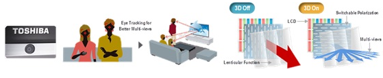 55X3具備3840x2160的高分辨率面板,3D模式時(shí)具備1280x720 HD的分辨率與9個(gè)視點(diǎn)。同時(shí)內(nèi)建兩顆強(qiáng)大的雙核心Cevo處理芯片以處理多視點(diǎn)影像(parallex images)運(yùn)算和畫質(zhì)升級(jí)(upscaling)。另外,55X3也具有眼球追蹤技術(shù),以便追蹤觀看者的位置來提供較合適的多視點(diǎn)影像。由于Toshiba的TMD面板廠并不具備大尺寸電視面板的生產(chǎn)能力,因此已經(jīng)與臺(tái)廠友達(dá)進(jìn)行技術(shù)合作開發(fā)。雖然裸眼3D電視剛起步,成本也相當(dāng)昂貴,但是可以預(yù)期從2012年開始,3D電視除了低價(jià)化以持續(xù)加大滲透率之外,裸眼3D技術(shù)也將為未來3D電視立下新的競(jìng)賽里程碑。