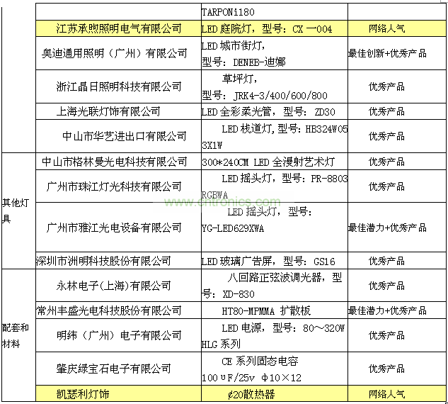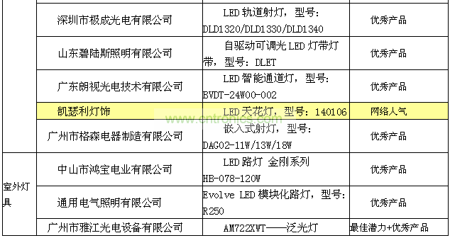 2012年6月9日,2012廣州國際照明展覽會開幕當天,主辦方組織20名終審專家對終審會議評選出來的獲獎候選產(chǎn)品進行現(xiàn)場的考核評審,最終確定35個優(yōu)秀產(chǎn)品獎,3個最佳創(chuàng)新獎、5個最佳潛力獎的獲獎名單;5個最佳網(wǎng)絡(luò)人氣獎是由網(wǎng)友海選出來的名單。