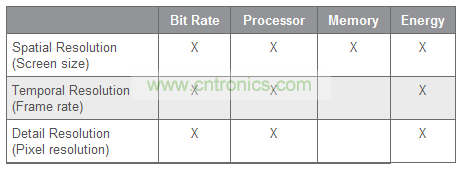 表 1 給出了不同視頻編碼參數(shù)對(duì)解碼設(shè)備所需資源選擇的大致影響。該表專(zhuān)門(mén)對(duì)采用運(yùn)動(dòng)補(bǔ)償與離散余弦變換 (DCT) 技術(shù)實(shí)現(xiàn)視頻壓縮的基于塊的視頻編解碼器進(jìn)行了分析。