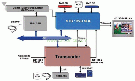 轉(zhuǎn)碼硬件必須與整個(gè) STB 系統(tǒng)中的其他系統(tǒng)進(jìn)行良好交互,其中包括數(shù)字調(diào)諧器、解多路復(fù)用器 (Demuxer) 和解調(diào)器、DDR2 存儲(chǔ)器、PCI 總線(xiàn),以及向 STB SoC 傳輸音/視頻的高帶寬接口。圖 2 給出了常見(jiàn)的架構(gòu)示意圖,但這不一定是一般性架構(gòu)。