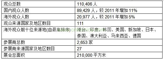 第十七屆「廣州國際照明展覽會(huì)」展覽面積達(dá)21萬平方米,規(guī)模較2011年增長5%,參展企業(yè)2653家,比上屆減少9%,參展企業(yè)來自全球27個(gè)國家和地區(qū)。本屆展會(huì)觀眾數(shù)目同創(chuàng)新高,吸引了110,406名觀眾,較2011年增長10%,分別來自111個(gè)國家及地區(qū),其中國內(nèi)專業(yè)觀眾89,429人,較2011年增加11%,海外專業(yè)觀眾20,977人,較2011年增加5%,海外觀眾前十位來源地分別是港澳臺(tái)地區(qū)、印度、韓國、美國、新加坡、日本、泰國、澳大利亞、馬來西亞和德國。大會(huì)同期舉辦的各類技術(shù)研討會(huì)、產(chǎn)業(yè)高峰論壇、產(chǎn)品推介會(huì)、交易節(jié)等高水平會(huì)議、論壇交流活動(dòng)多達(dá)110多場次,較去年增加10場,亦創(chuàng)新高。
