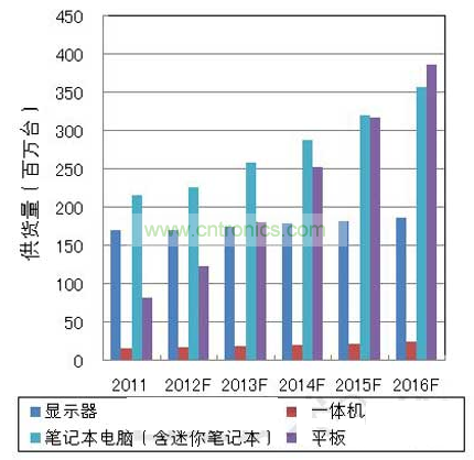 未來的市場(chǎng)動(dòng)向方面,筆記本電腦市場(chǎng)的年增長率有望達(dá)到10~15%左右,平板電腦市場(chǎng)將憑借低價(jià)格和輕便、應(yīng)用程序與智能手機(jī)的通用性,繼續(xù)保持大約30~40%的增長率,到2016年,平板電腦的供貨量預(yù)計(jì)將超過筆記本電腦(圖1)。