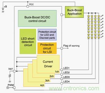 近年來,在車載用顯示器領域,為滿足有害物質限制要求,使用水銀的CCFL背光燈正在被LED背光燈迅速取代。另外,儀表盤、汽車導航、音響顯示、后座娛樂等各種車載用顯示器正朝多樣化、大型化方向發展。在這種趨勢下,對于增加LED燈數量以及高亮度、高調光率的要求日益高漲。ROHM為滿足LED燈數量增加的這種發展趨勢需求,將實現高耐壓的升降壓DC/DC轉換器、可多燈驅動小功率LED且實現了高調光率的電流驅動器電路內置于一枚芯片,擴充了LED驅動器產品陣容。