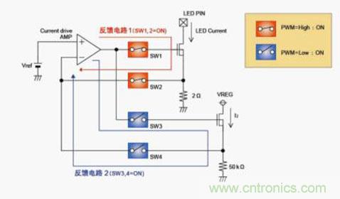 這兩條反饋通路由各SW進行切換。在PWM=High(LED為ON)區間,驅動LED電流輸出用的反饋電路(圖3反饋電路1),由LED引腳灌入LED電流。在PWM=Low(LED為OFF)區間,驅動另一條反饋電路(圖3反饋電路2),由內部恒定電壓VREG產生電流。通過進行這樣的控制,LED電流雖然是關斷的,但電流驅動放大器始終處于驅動狀態,PWM=Low→High時可平穩生成LED電流。由于反饋通路2的電流I2已設定為數μA,因此,本電路結構的功耗增加量已達到可以忽視的水平。