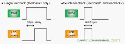 圖4為LED電流在有無與輸出不同的反饋通路時對PWM信號的跟隨性如何變化的比較數據。