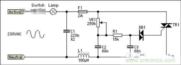 如圖所示,前部分L1、C1是RF抑制電路, VR1、R1、C2、C3構成RC電路,當RC充電電壓大于DB1(DIAC)導通電壓時,DB1導通,觸發TR1(TRIAC)導通,這時220V電壓 加在燈泡上,當電流過零時,TR1關斷。如此重復。通過改變VR1電位計的大小可以改變時間常數RC,進而改變導通角。即我們斬波的寬度。