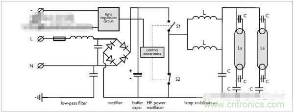 熒光燈的調光(1-10V)熒光燈的調光是在高頻電子鎮流器的基礎上研發出來的。下面是高頻電子鎮流器的線路圖: